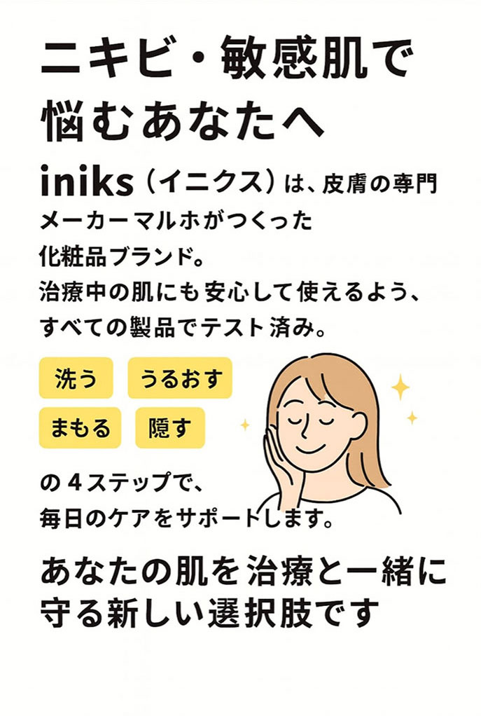 にきび(痤瘡)や敏感肌(アトピー性皮膚炎)向けの化粧品は多くのメーカーが既に取り扱っていますが、iniks(イニクス)は、皮膚医薬品の専門メーカー、マルホがつくった化粧品ブランド。